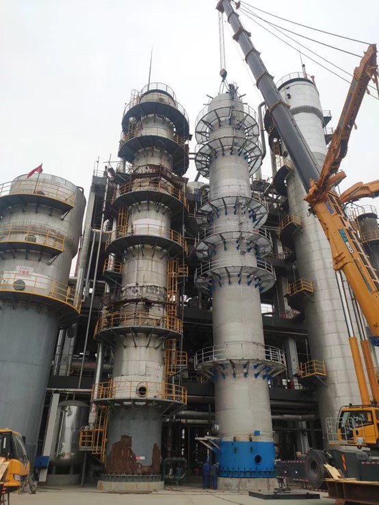 恒通化工項目雙氧水裝置氫化塔氧化塔更換工程氧化塔一次吊裝就位成功
